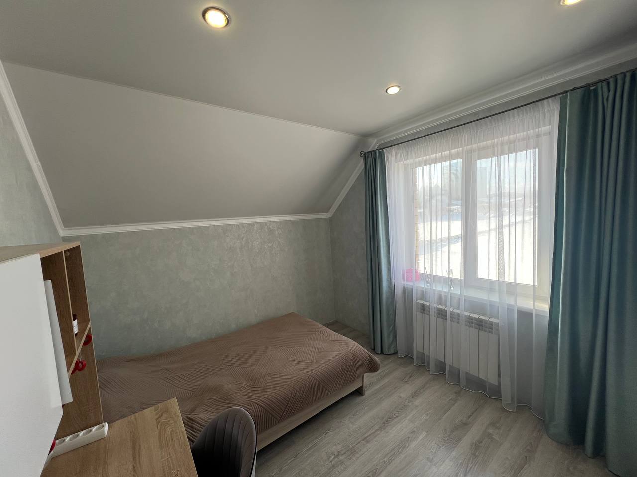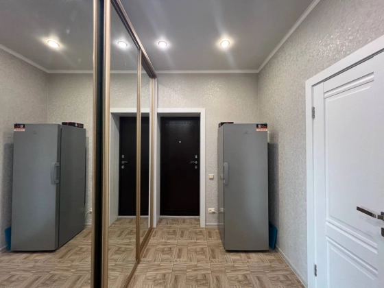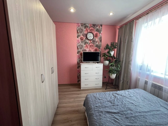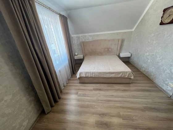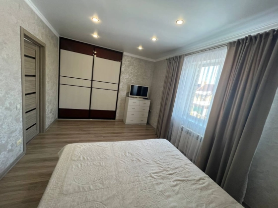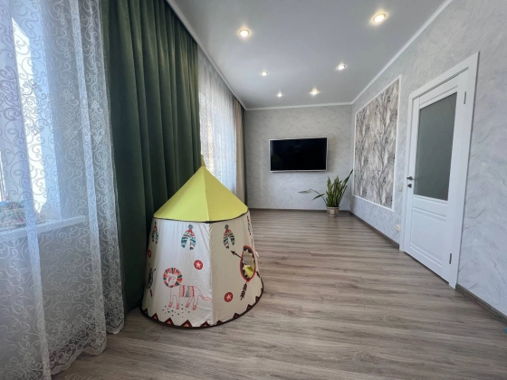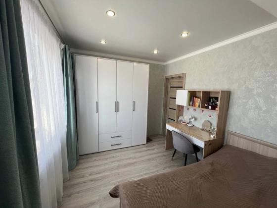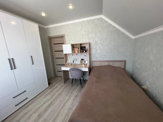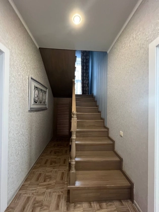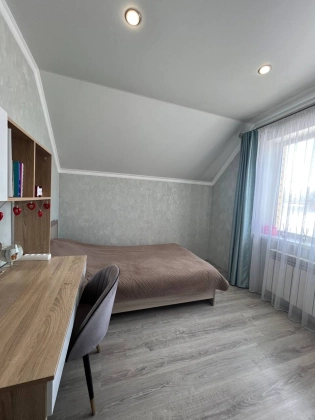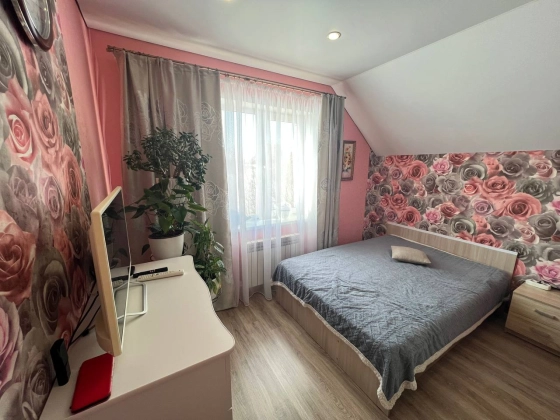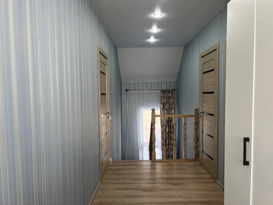 На втором этаже три просторные спальни с гардеробными зонами гарантируют личное пространство для каждого члена семьи. Кладовка легко превращается в дополнительный санузел, повышая удобство. Лестница из дерева соединяет этажи плавно и безопасно. Натяжные потолки с точечным освещением создают атмосферу тепла и роскоши в каждой комнате.