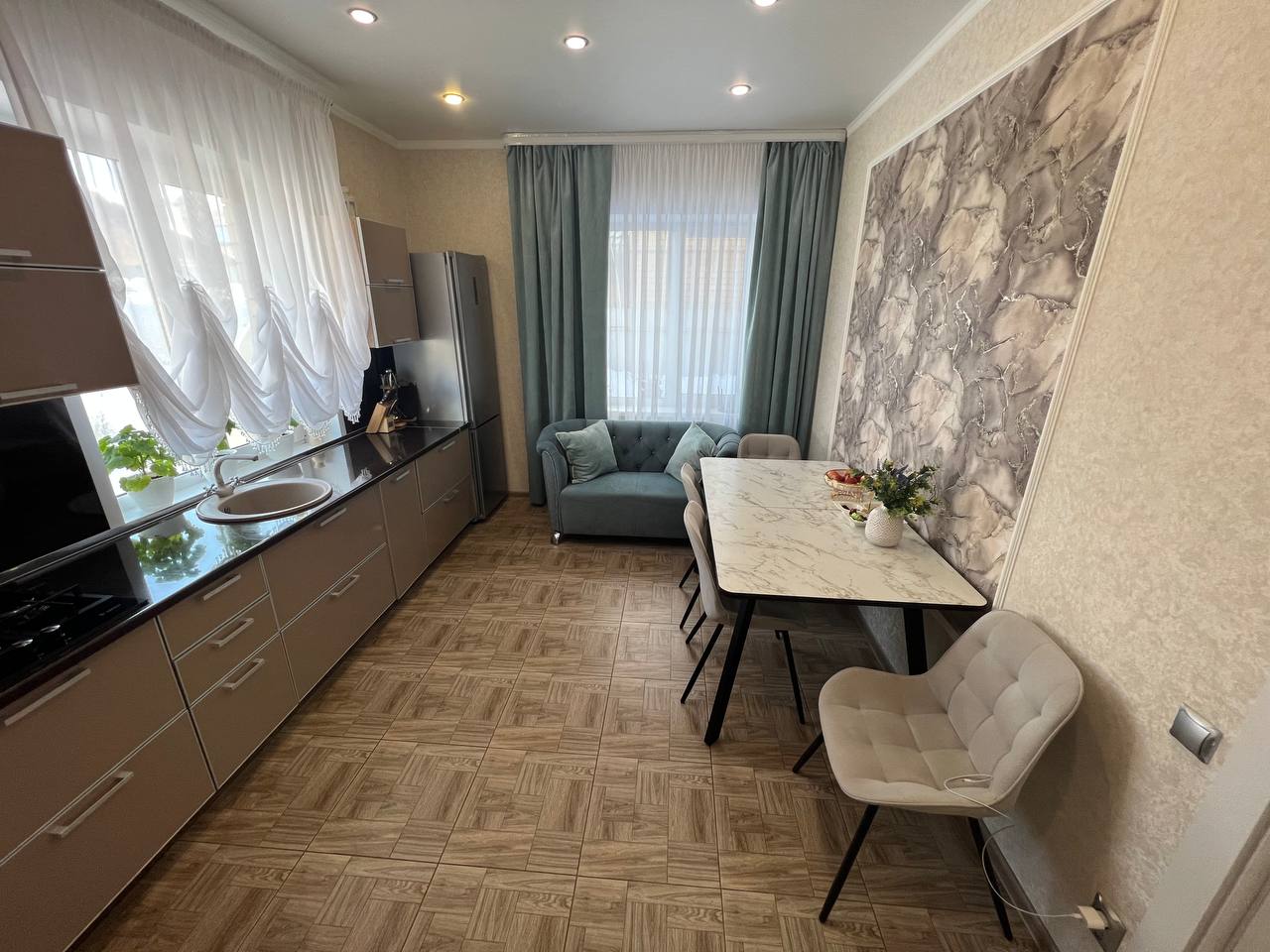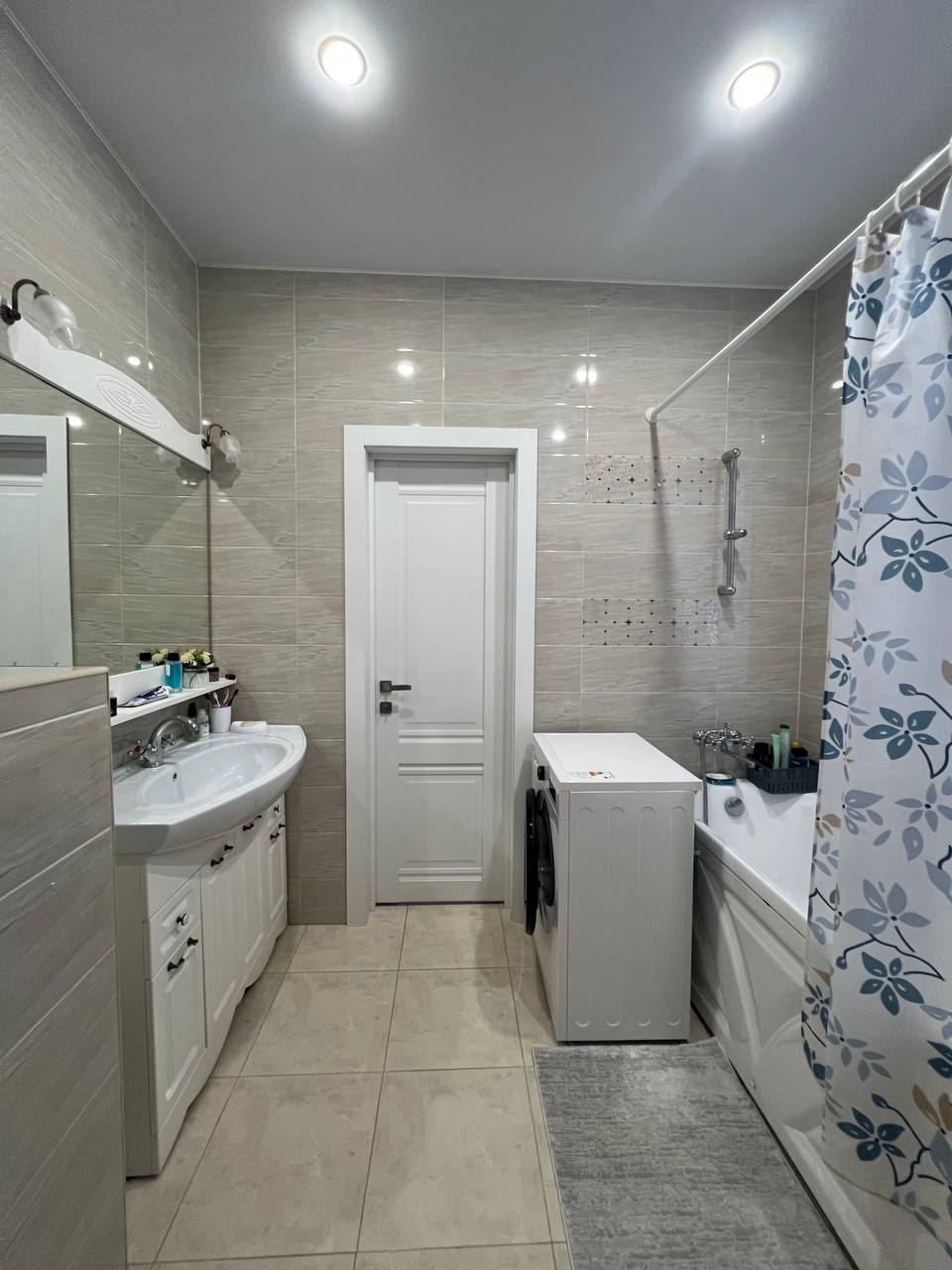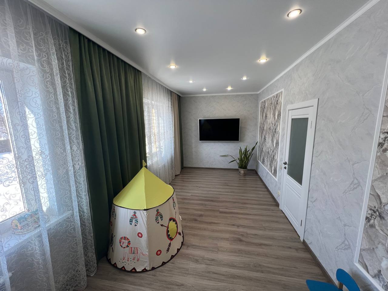 Во всём доме натяжные потолки с встроенными светильниками.